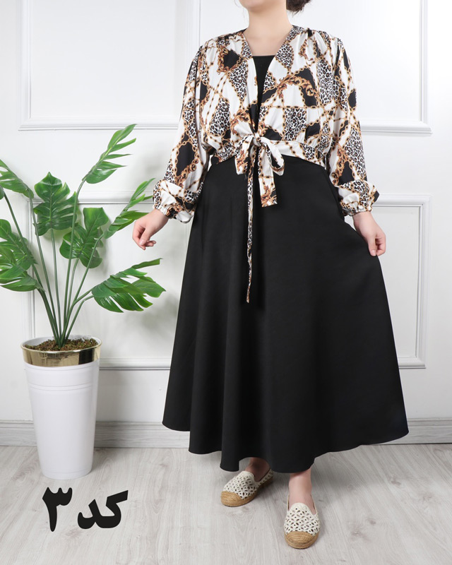 سایز 3 : دور سینه کراپ 120 سانت دور حلقه آستین 52 سانت قد آستین 56 سانت قد کراپ 45 سانت دور کمر دامن 90سانت دور باسن 176 سانت قد دامن 85 سانت