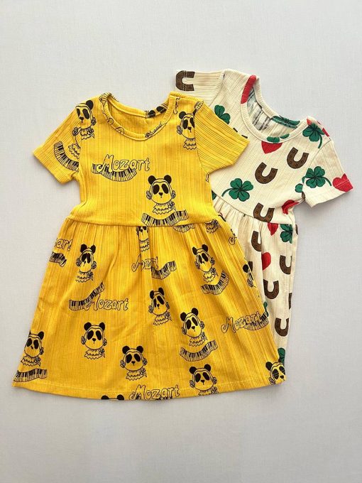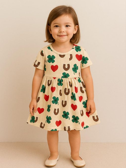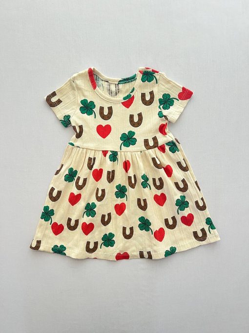 طرح شاد و کودکانه با قلبهای قرمز، شبدرهای سبز و نعل اسبهای قهوهای، جلوهای زیبا و خاص به این لباس بخشیده و آن را به گزینهای جذاب برای مهمانی، جشن تولد و حتی استفاده روزمره تبدیل کرده است.