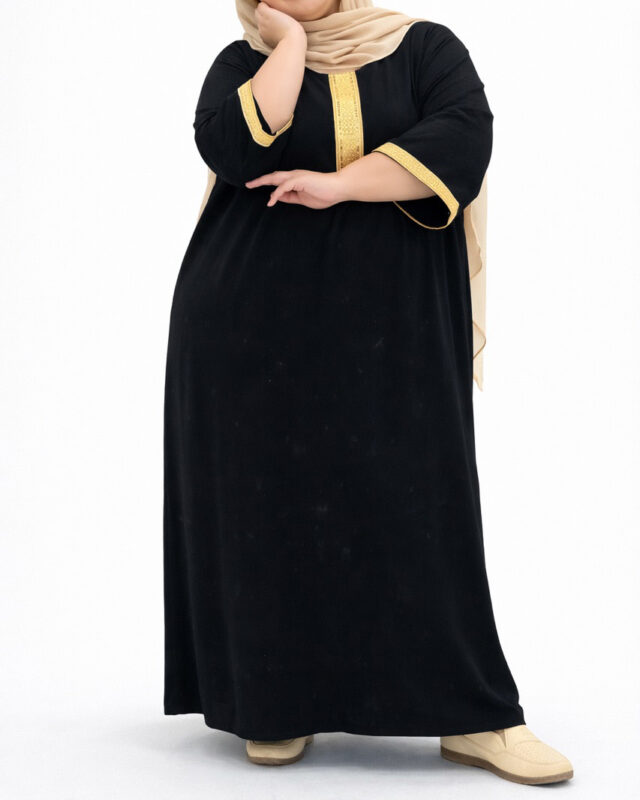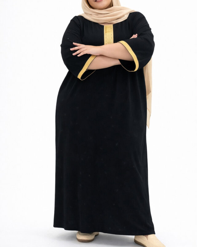 • رنگ: مشکی تکرنگ با خرجکار نوار طلایی ظریف روی یقه و آستینها